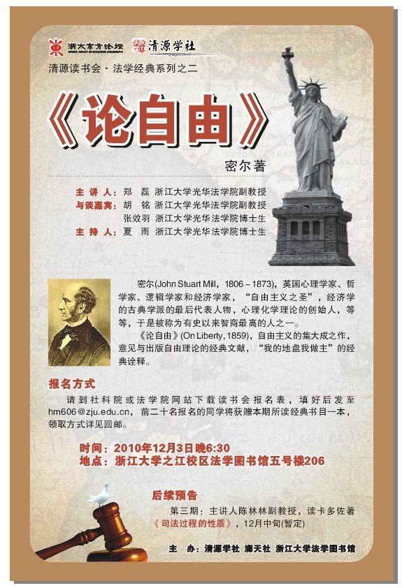 请到社科院或法学院网站下载读书会报名表,填好后发至 hm606@zju.edu.cn, 前二十名报名的同学将获赠本期所读经典书目一本,领取方式详见回邮。