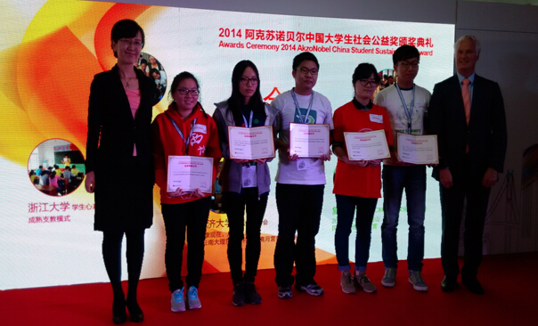 第三届“阿克苏诺贝尔中国大学生社会公益奖”(下文简称“大学生公益奖”)颁奖典礼于2014年11月5日在上海举行。本次大学生公益奖一共颁出67个奖项,由浙江大学中国西部发展研究院(以下简称“西部院”)指导的学生社团——浙江大学学生心系西部协会(以下简称“浙大西协”)凭借“成熟支教模式”项目脱颖而出,荣获金奖,是继浙大西协斩获2012年“阿克苏诺贝尔大学生社会公益”铜奖后的再获殊荣,也是我校到目前为止获得的唯一金奖。