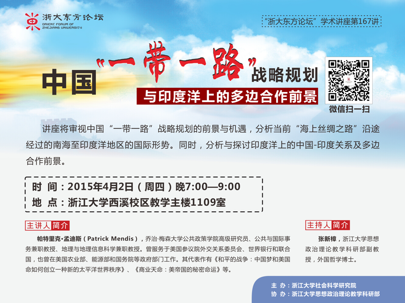 讲座将审视中国“一带一路”战略规划的前景与机遇,分析当前“海上丝绸之路”沿途经过的南海至印度洋地区的国际形势。同时,分析与探讨印度洋上的中国-印度关系及多边合作前景。