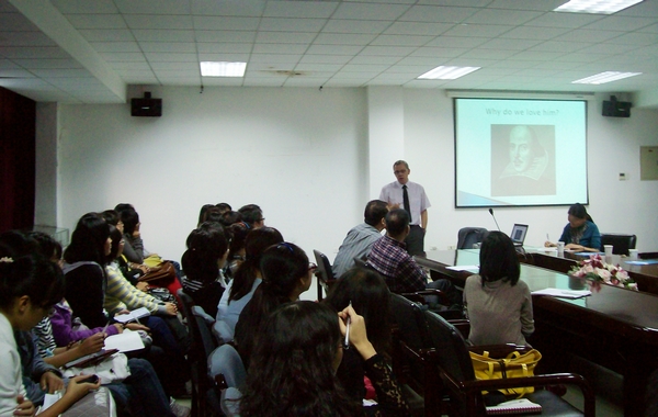 The lecture won great applause. Teachers and students also asked questions about Shakespeare and his works, such as Shakespeare’s display of the true love, the British style in Romeo and Juliet, the popularity of Shakespeare’s works nowadays, and the value of researching Shakespeare’s works, which were all explained by Dr. Leahy in detail. They were all filled with admirations for Dr. Leahy’s humorous way of delivering a lecture, and got a deeper understanding of the greatest British playwright, Shakespeare, and benefited a great deal from this lecture.
