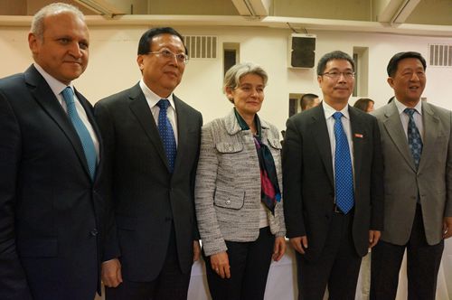 Hao Ping,Chairman of 37th UNESCO general conference(second from left), Irina Bokova, Director-general of the UNESCO(in the middle), Luo Weidong,