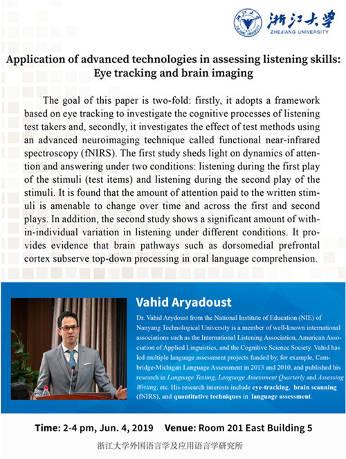 【Speaker Introduction】:Dr. Vahid Aryadoust from the National Institute of Education of Nanyang Technological University is a member of well-known international associations such as the International Listening Association, American Association of Applied Linguistics, and the Cognitive Science Society.
